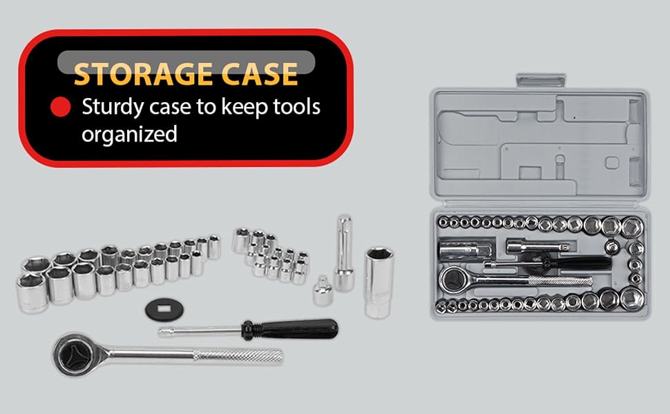 • COMPLETE SET: Complete 40-piece set includes a ratchet, extension bar, 1/4-inch spinner handle, spark plug socket, adapter, and more, this set is incredibly versatile and can handle any job.